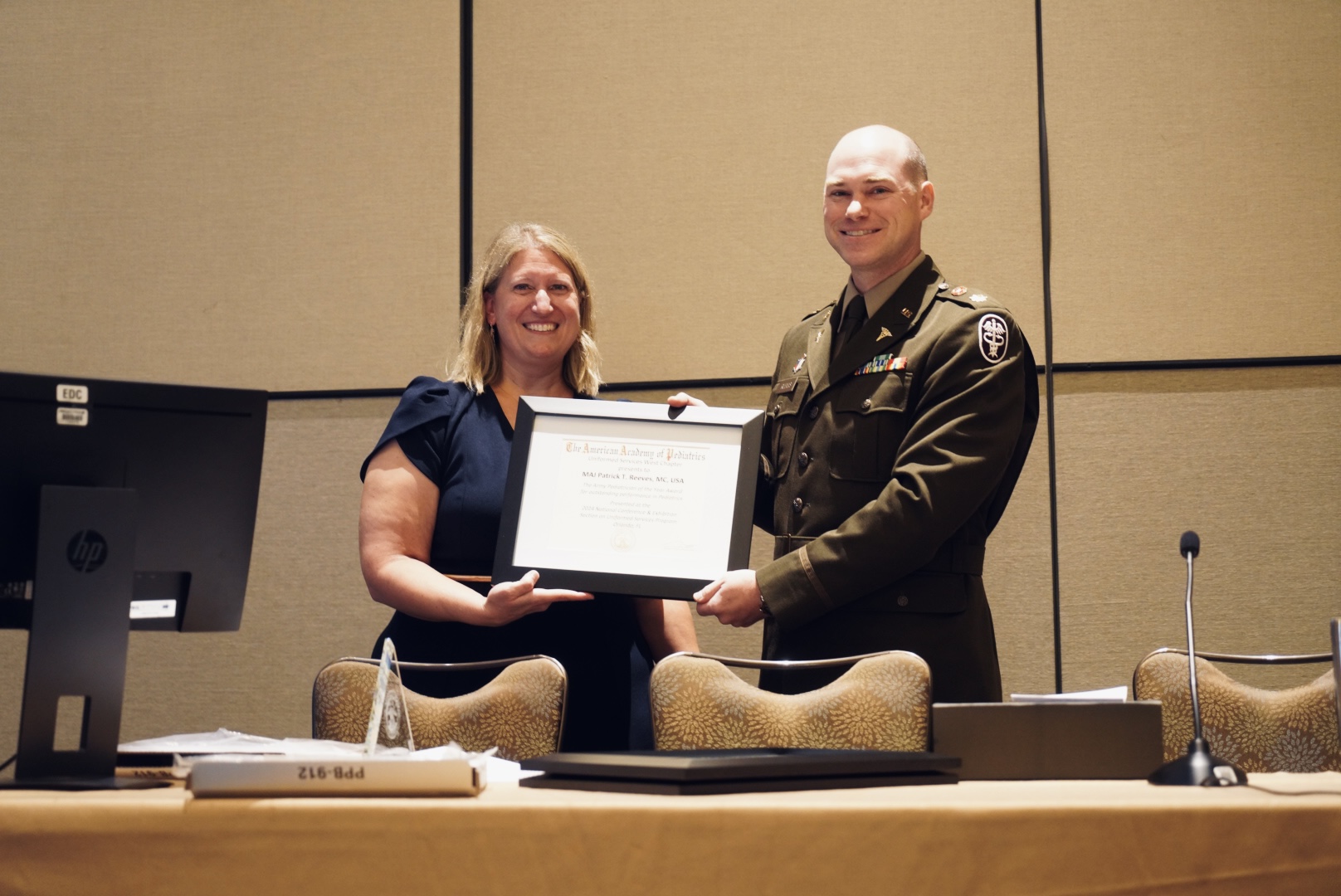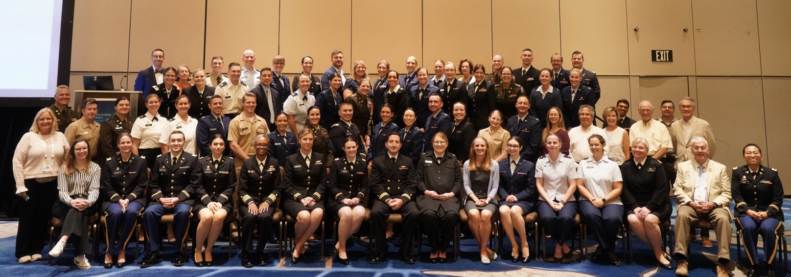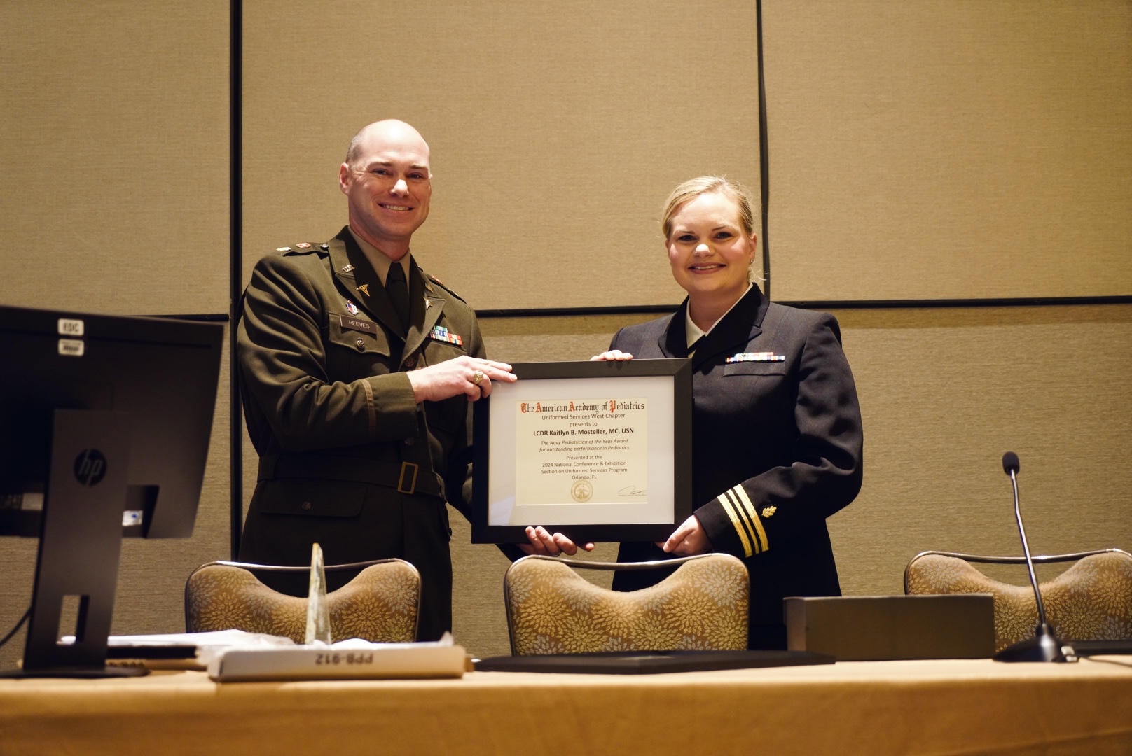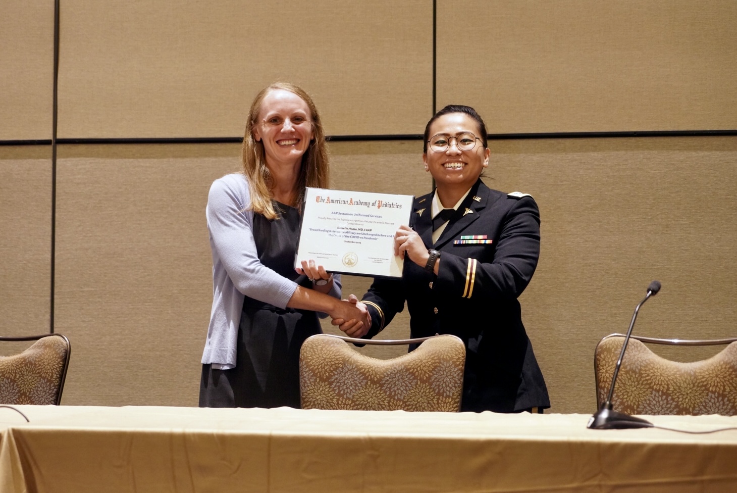 Group photo of attendees from both Unformed Serves West and East taken at AAP NCEMaj Patrick Reeves receiving Army Pediatrician of the YearLCDR Kaitlyn Mosteller receiving Navy Pediatrician of the Year Maj Brena Haughey, MD, USAF receiving Air Force Pediatrician of the Year at the AAP National Conference & ExhibitionCPT Richelle Homo receiving First Place Andrew Margileth Abstract Award and Top Manuscript of 2023 Scientific Abstract Competition